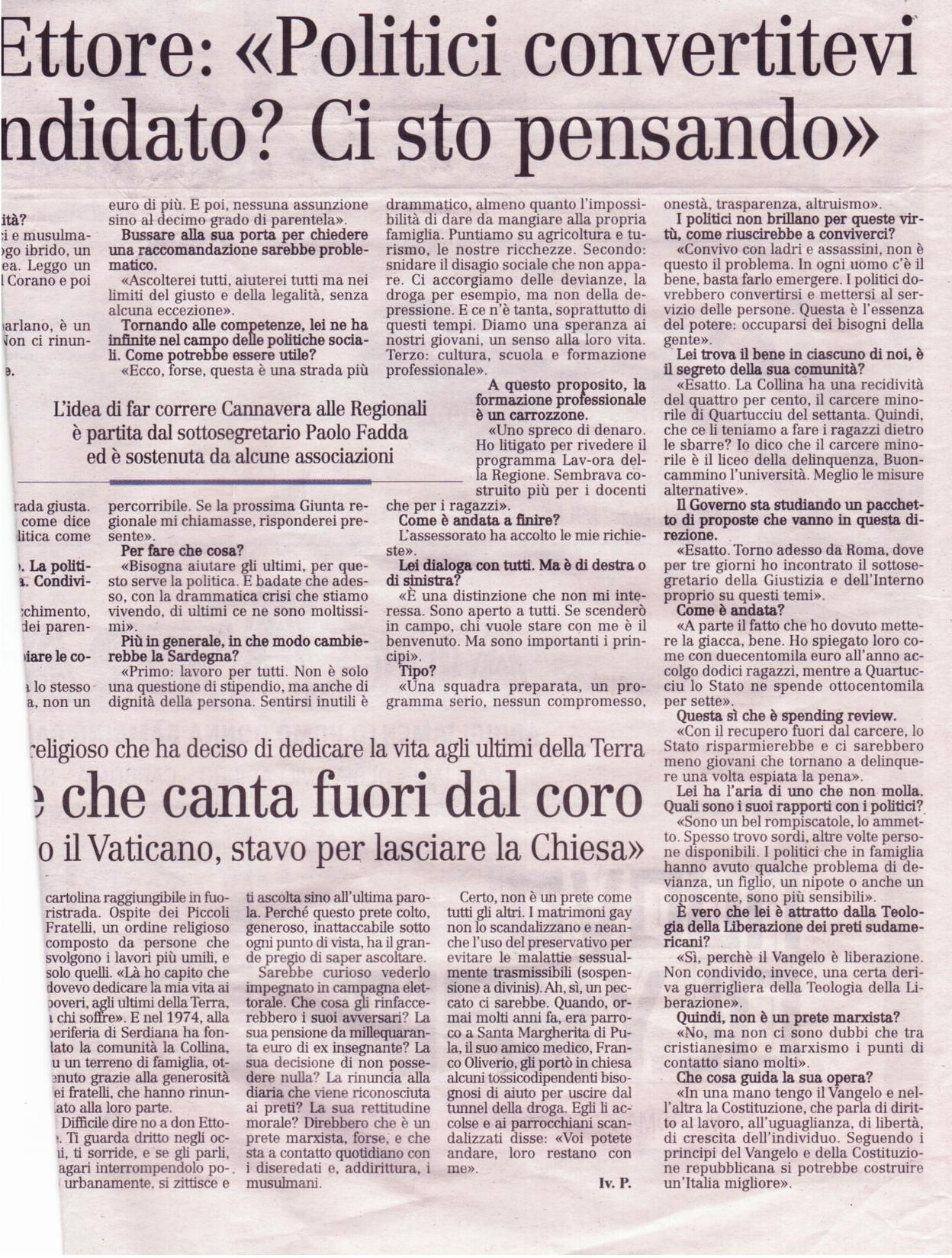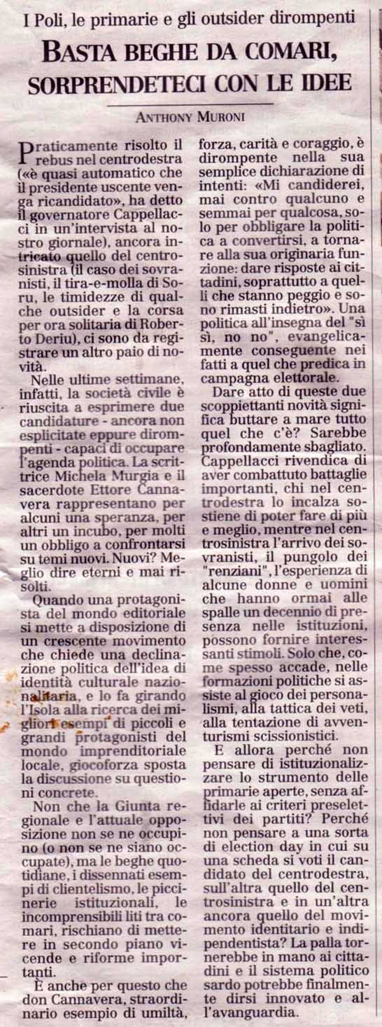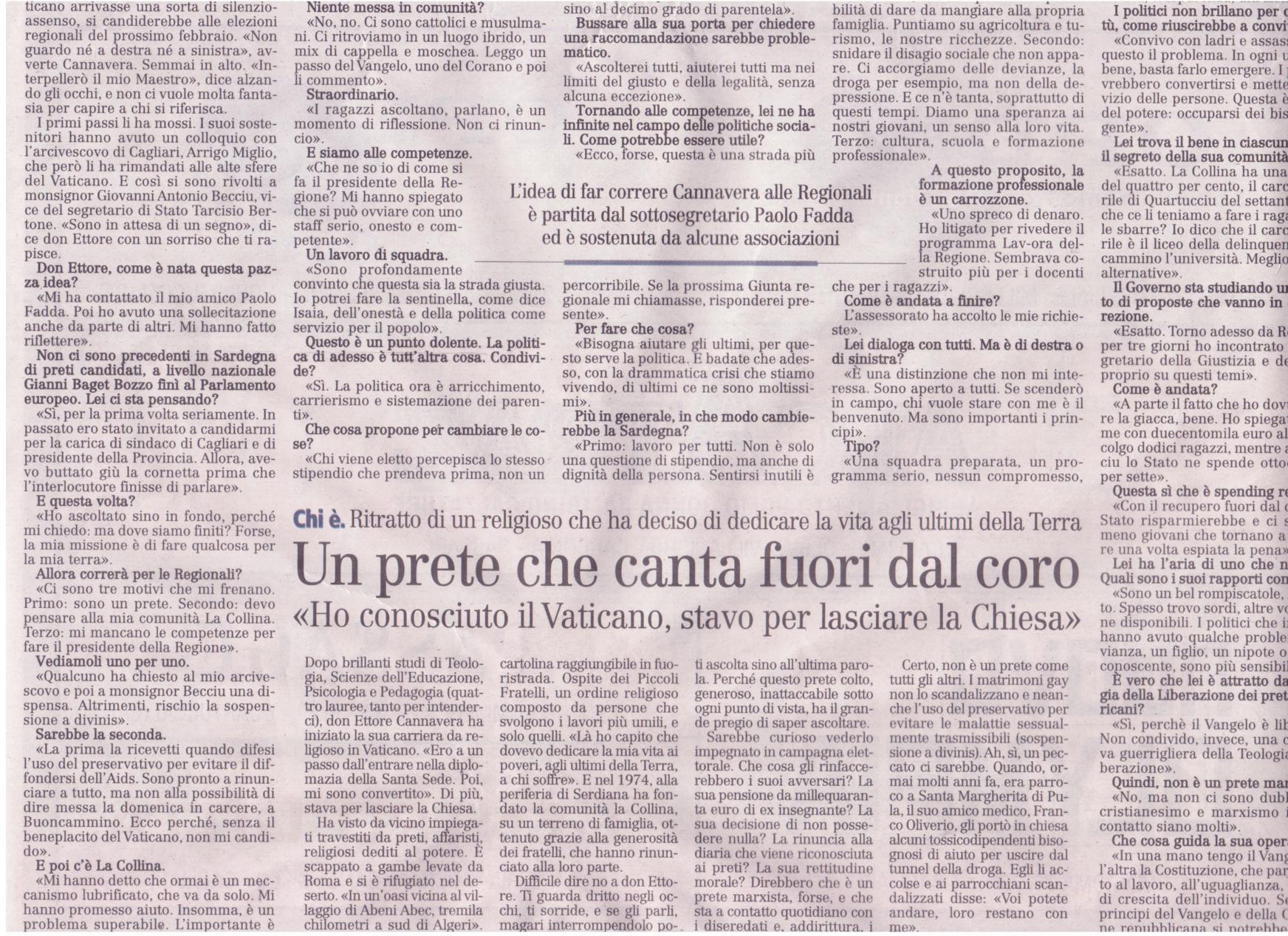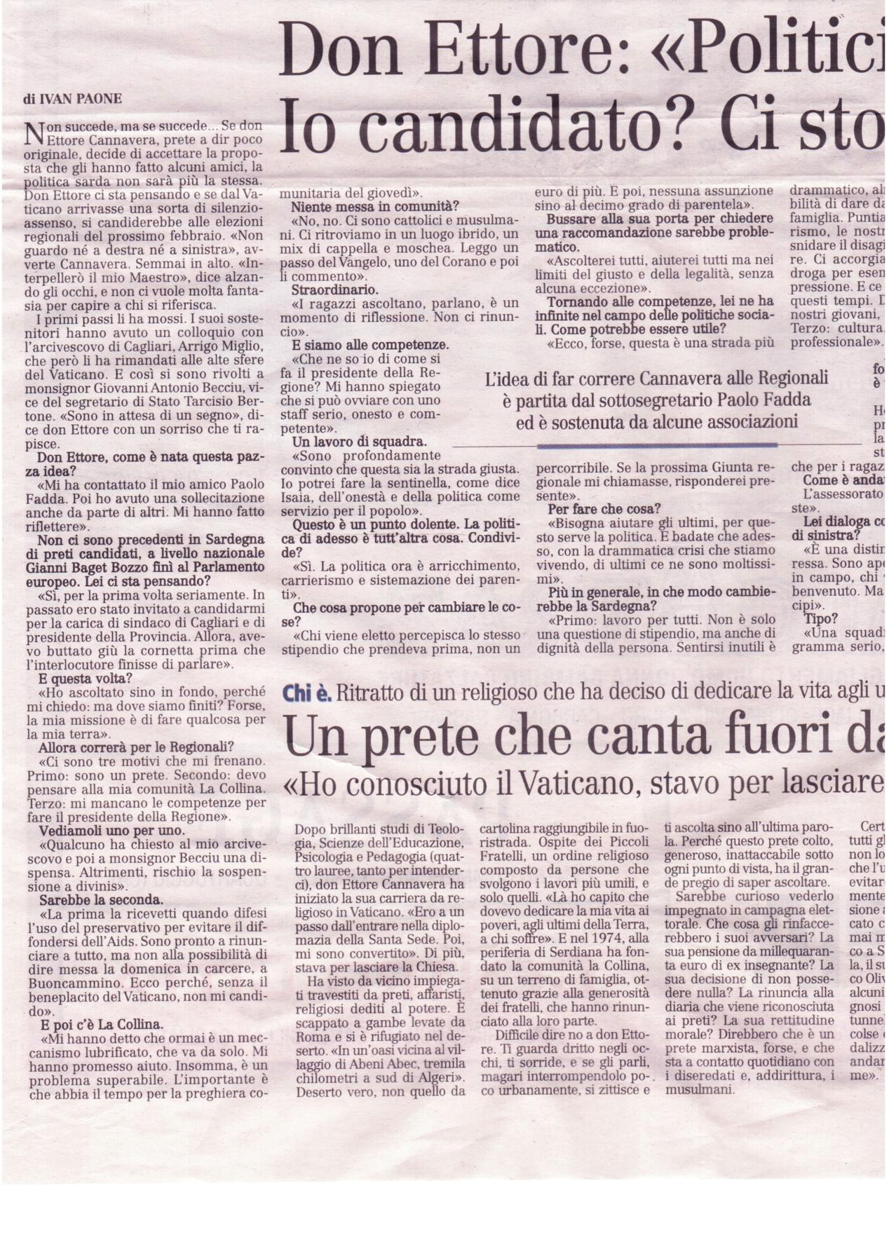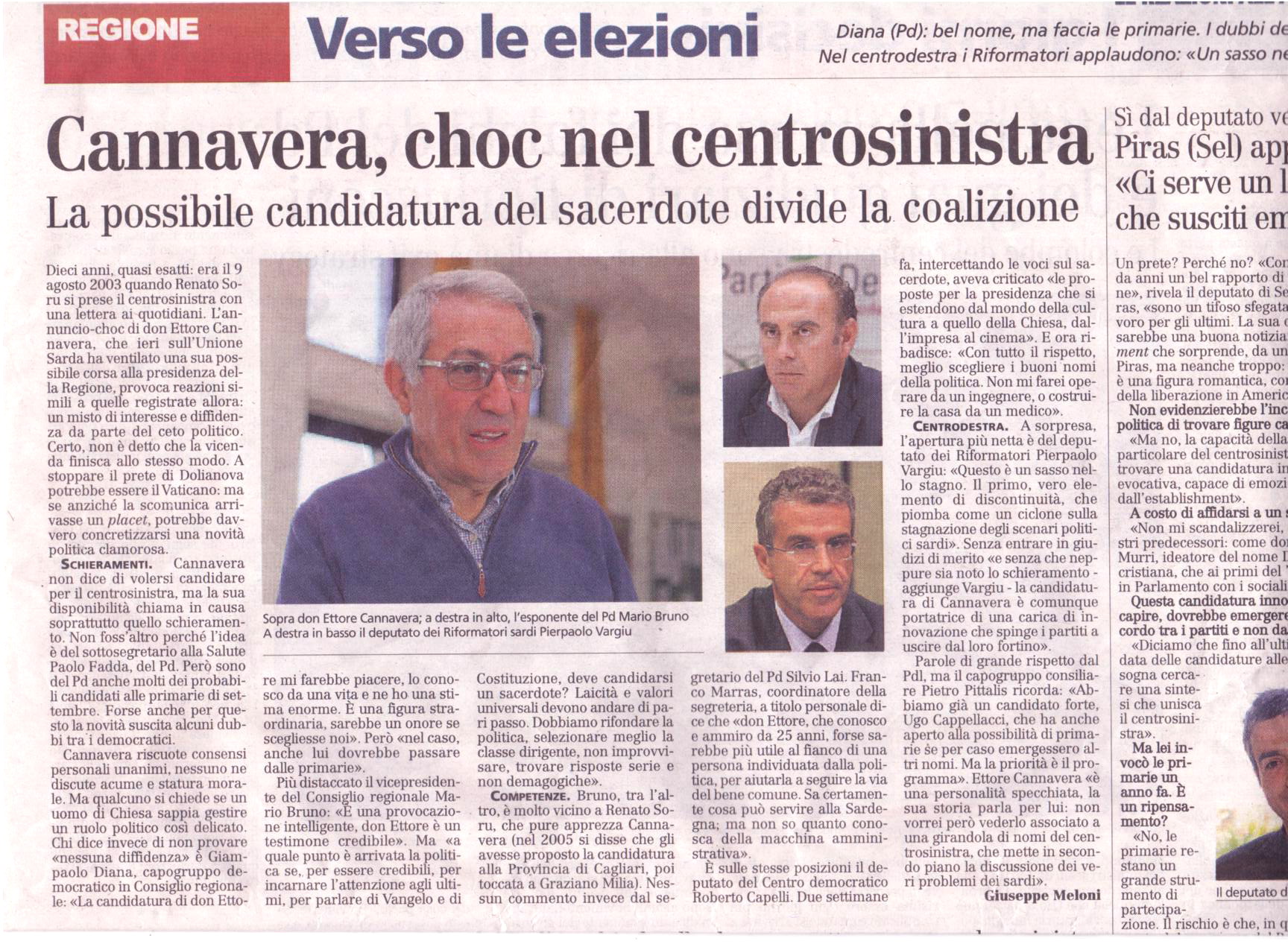 Il prode don Ettore Cannavera accettando la proposta di candidarsi (salvo un veto ecclesiastico) entra in modo dirompente in uno scacchiere complicato di proponenti alle elezioni (quindi anche alle primarie) del Presidente della Regione della Sardegna.