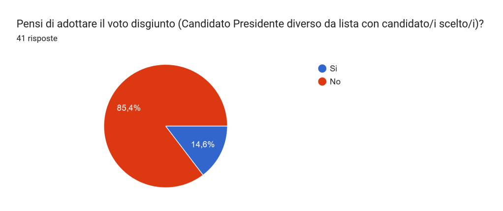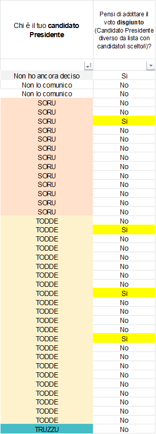 Non possiamo trarre molte conclusioni, ma almeno una similitudine nel voto disgiunto tra chi ha votato Soru (ma non una sua lista) con 1/13 e chi ha votato La Todde ma non le sue liste 3/23 (un filo superiore). Non valutabile su Truzzu.