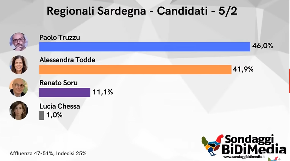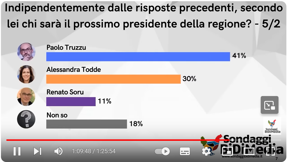 L’unico intervistato che ipotizzava Truzzu ha immaginato che arrivasse primo e poi la Todde e infine Soru terzo. Visto lo scarto ridotto a chiusura delle votazioni consideriamo una naturale speranzosa previsione del tutto ragionevole, compresa la terza posizione di Soru come daltronde quella di Chessa ultima.
